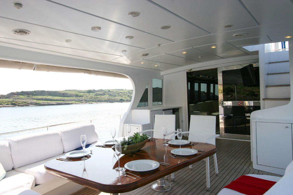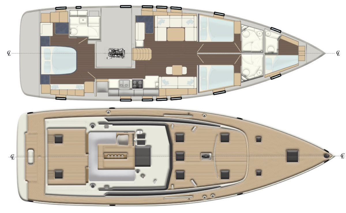 Layout: Spacious flybridge with panoramic views, multiple guest cabins and generous outdoor relaxation areas.